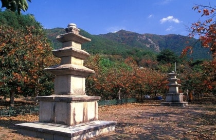 고풍스러운 사찰 건축물과 울창한 숲길이 어우러져